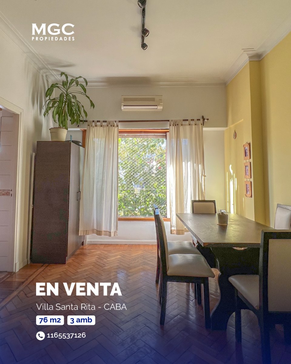 VILLA SANTA RITA - VENTA 3 AMBIENTES - 76 M2 - IMPERDIBLE!! Viví en un 3 ambientes súper luminoso y ventilado en zona residencial y comercial, a 3 cuadras de Av. Nazca, a 6 de Juan B. Justo (Metrobus) y a 15 del Subte A. Cerca de escuelas, clubes y del centro de Villa del Parque 🏙️ Ubicado en 1° piso al frente (acceso por escalera) en edificio de 4 pisos con solo 2 deptos por piso 🏢. Son 76 m² totales: amplio living comedor con gran ventanal 🪟, cocina con alacenas alto y bajo mesada, espacio para heladera y lavarropas, y ventana al frente 🍳. Pasillo distribuidor con gran placard 🧥. Baño completo con bañera y excelente ventilación 🛁. Dormitorio principal al frente con balcón y placard 🌿🛏️; segundo dormitorio al contrafrente con placard 🛏️. Pisos de madera y techos altos ✨. Servicios individuales: calefón y estufas 🔥. Terraza de uso común en el 4° piso ☀️. Apto crédito ✅. Acepta mascotas 🐾. 💧. Año de construcción: 1960 🏗️. Todo en excelente estado. ¡Imperdible! Consultá por WhatsApp al 11 6553 7126 📲 “Medidas y gastos sujetos a verificación y ajuste. Fotos no contractuales.”